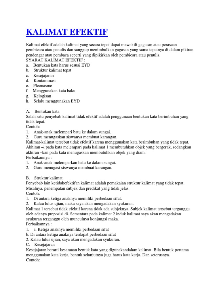 Makalah Bahasa Indonesia (EYD Dan Kalimat Efektif) from imgv2-1-f.scribdassets.com Kalimat efektif adalah kalimat yang disusun berdasarkan kaidah penulisan yang berlaku, sehingga mampu menyampaikan pesan, gagasan dan perasaan kepada orang lain sesuai keinginan penutur. Resume adalah cara efektif untuk melakukannya. Kalimat efektif tidak akan menjadi efektif tanpa pemahaman terhadap eyd dan tanda baca. Kalimat efektif adalah sebuah kalimat yang dapat dipahami serta membangkitkan gagasan atau ide yang dimiliki pendengar. Penggunaan kalimat efektif perlu diperhatikan baik dalam tulisan maupun secara lisan. Kalimat efetif tepat sasaran meninggalkan pengaruh menimbulkan pesan menerbitkan akibat a=a ciri 1. Pentingnya pembelajaran kalimat efektif dilakukan untuk mengasah kemampuan mahasiswa dalam mengungkapkan gagasan yang dapat langsung dipahami oleh pembaca/pendengar tanpa. Kalimat efektif merupakan kalimat dengan unsur yang utuh dan tepat.